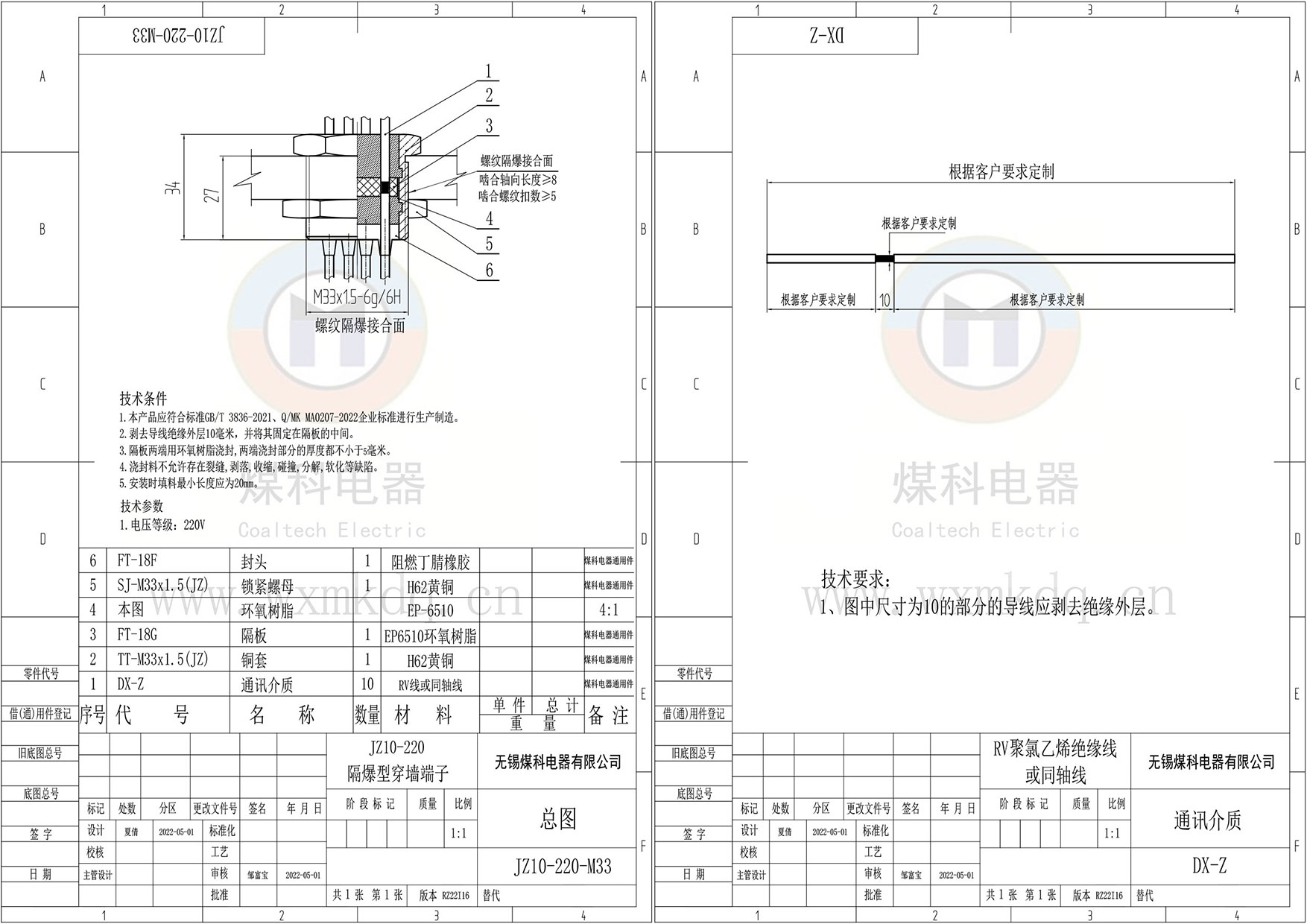 (1)隔爆面安裝銅套;(2)芯數;(3)導線(xiàn)顏色;(4)導線(xiàn)規格(平方數);(5)上端(法蘭側)預留多長(cháng);(6)下端(鎖緊螺母側)預留多長(cháng)。