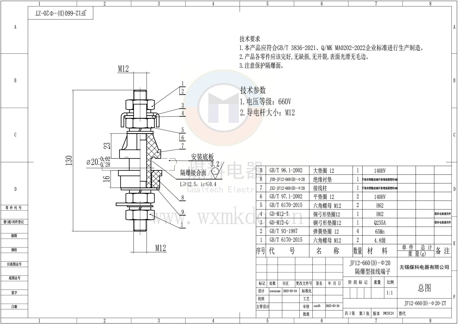 ◆ 安裝尺寸:Φ20(隔爆面尺寸),另有隔爆面尺寸Φ22可以選擇(對應型號:JF12-660(D)-Φ22)