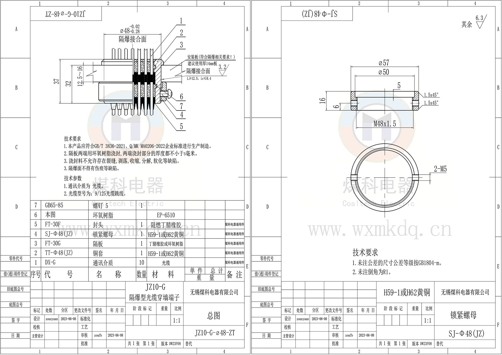 (1)隔爆面安裝銅套;(2)芯數;(3)光纖及接頭規格;(4)上端(法蘭側)預留多長(cháng);(5)下端(鎖緊螺母側)預留多長(cháng)。