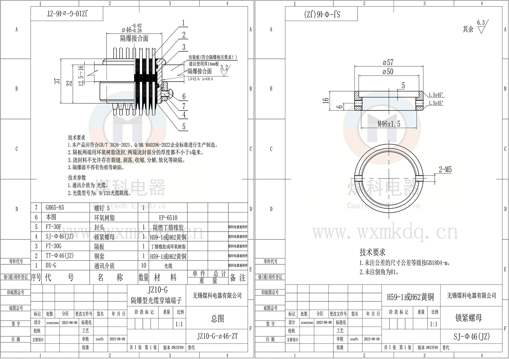 (1)隔爆面安裝銅套;(2)芯數;(3)光纖及接頭規格;(4)上端(法蘭側)預留多長(cháng);(5)下端(鎖緊螺母側)預留多長(cháng)。